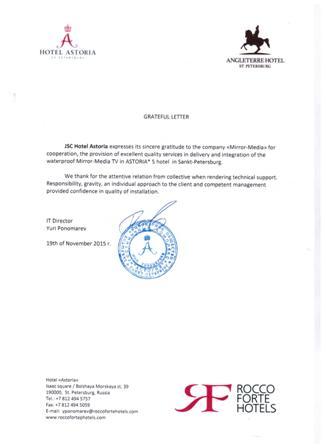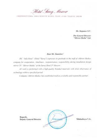 В питерскую «Асторию» планировали закупать зеркальные телевизоры израильской Westvision. «Поставщики компании постоянно менялись, это было неудобно», — говорит ИТ-директор Metropol & Petroff Palace Йоханн Шиффмахер. Mirror Media ему посоветовал один из партнеров: качество продукции, доставка и техническая поддержка оказались даже лучше, чем у зарубежных производителей. В итоге телевизоры Mirror Media закупили и для «Метрополя».