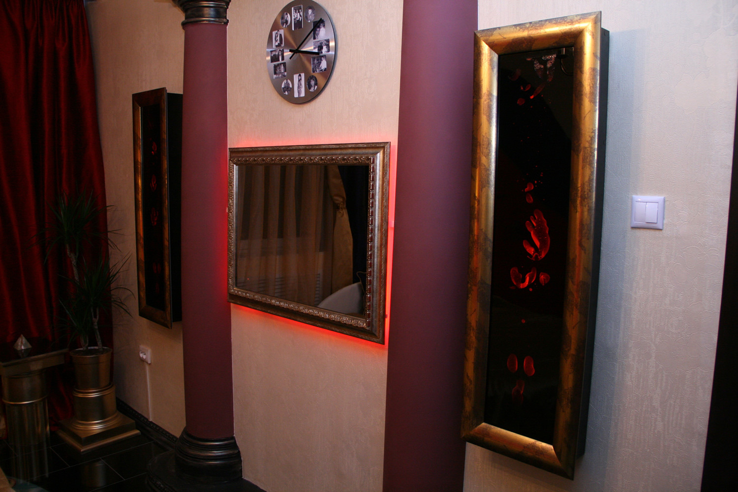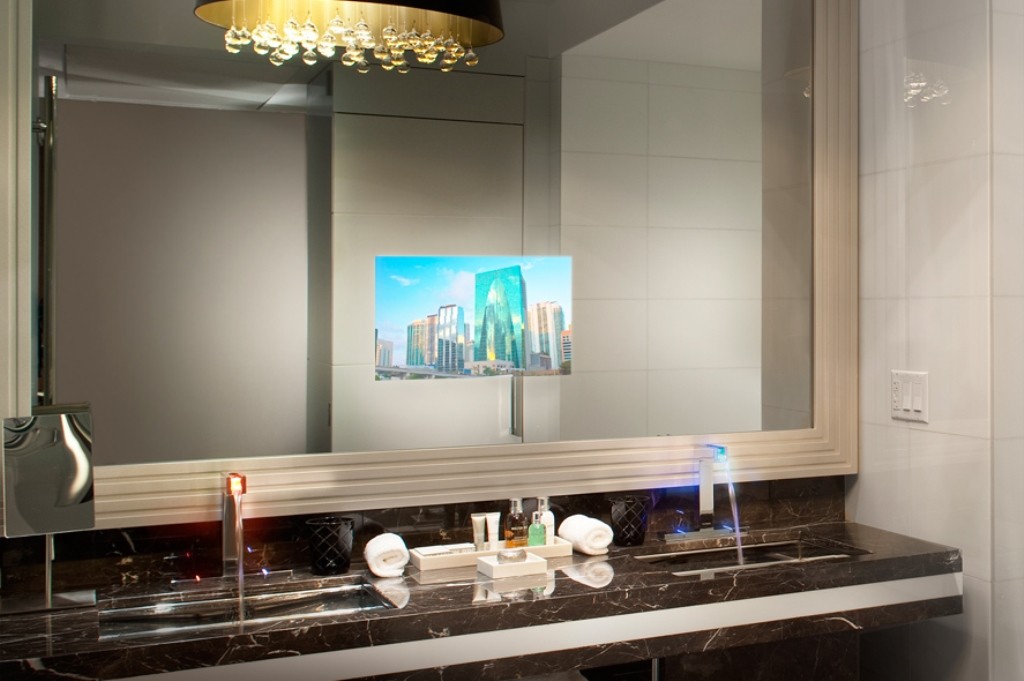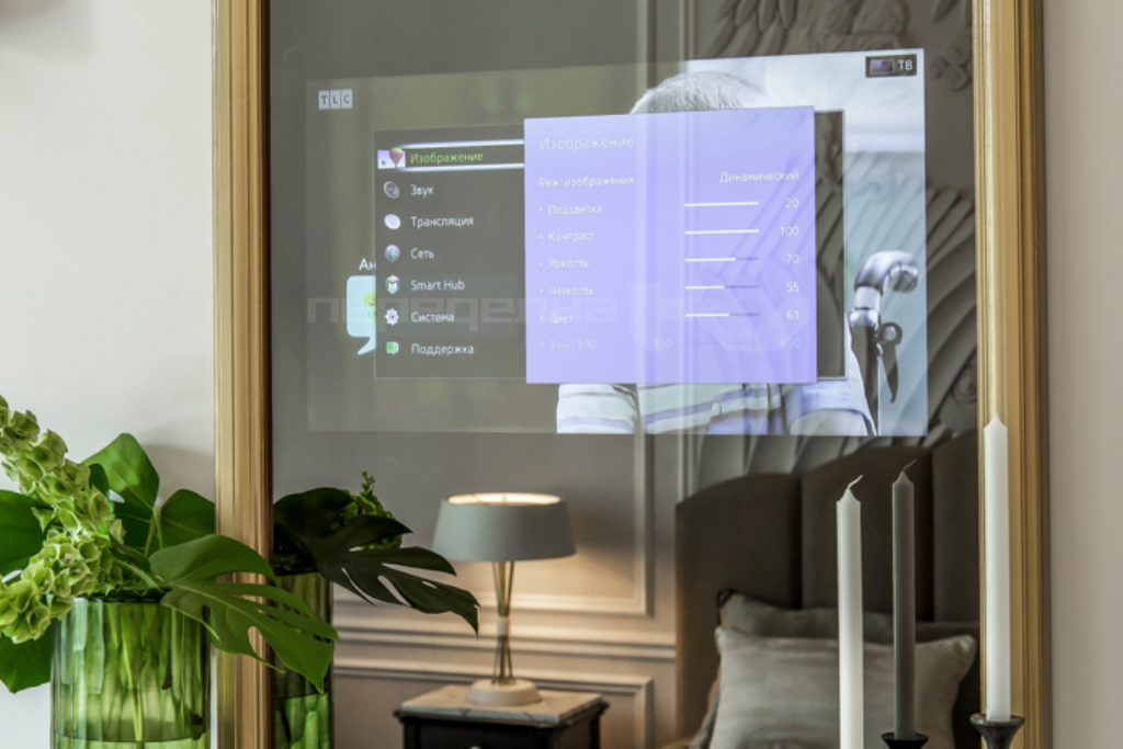 Распознать до включения за зеркальной поверхностью скрытое устройство невозможно, если не знаешь о его существовании. Только представьте, зеркало, само по себе служащее украшением любого интерьера, обрамленное шикарной рамой, в нужный момент превращается в телевизор!
