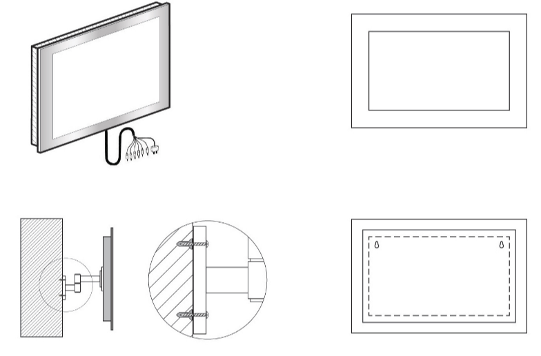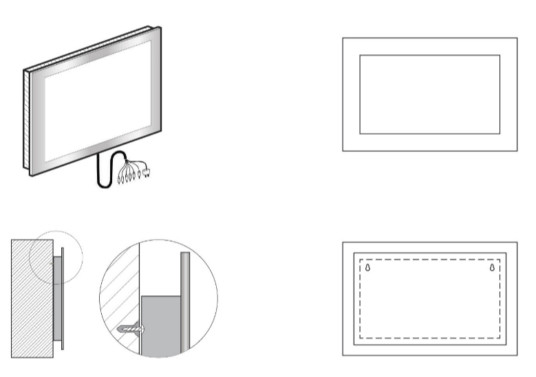 Для осуществления этого типа монтажа необходимо подготовить нишу по предоставленным нами размерам, в которую телевизор вставляется так, что зеркальная поверхность и стена образуют единую плоскость.